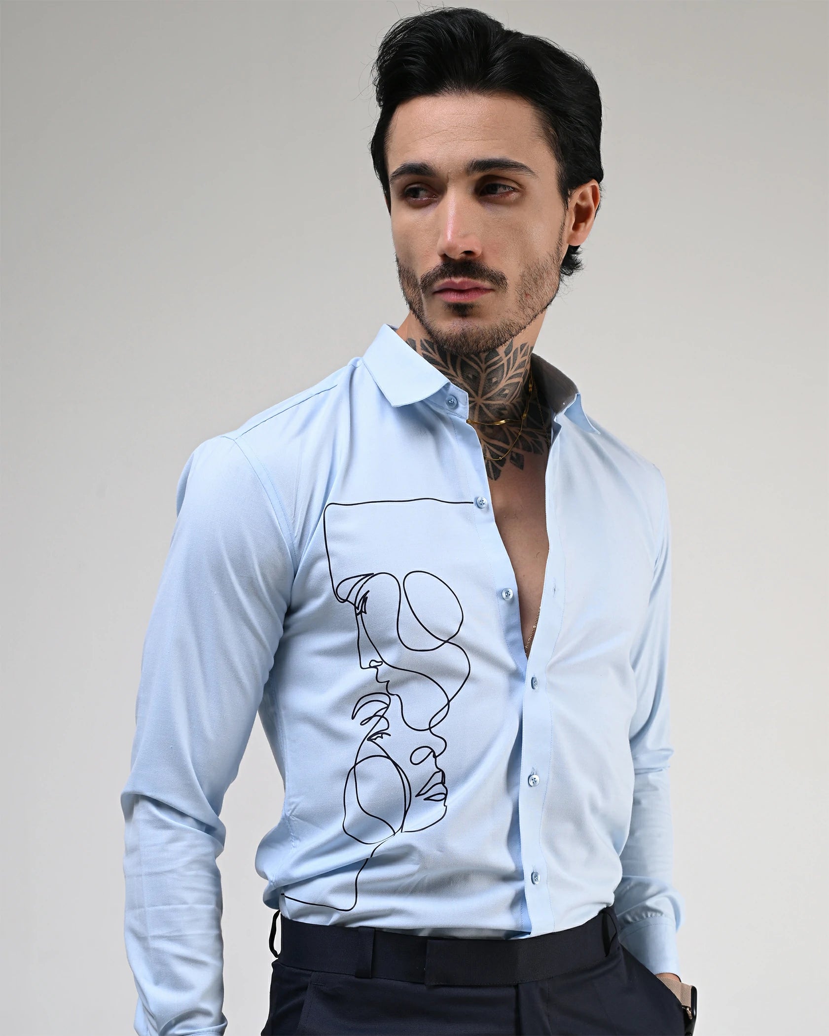 Break away from the ordinary with this sky blue shirt featuring a captivating abstract face line-art design. Crafted from smooth, breathable fabric with a subtle texture, this shirt effortlessly combines minimalism with expressive detailing. pairs perfectly with navy trousers or chinos for a smart-casual or semi-formal look.