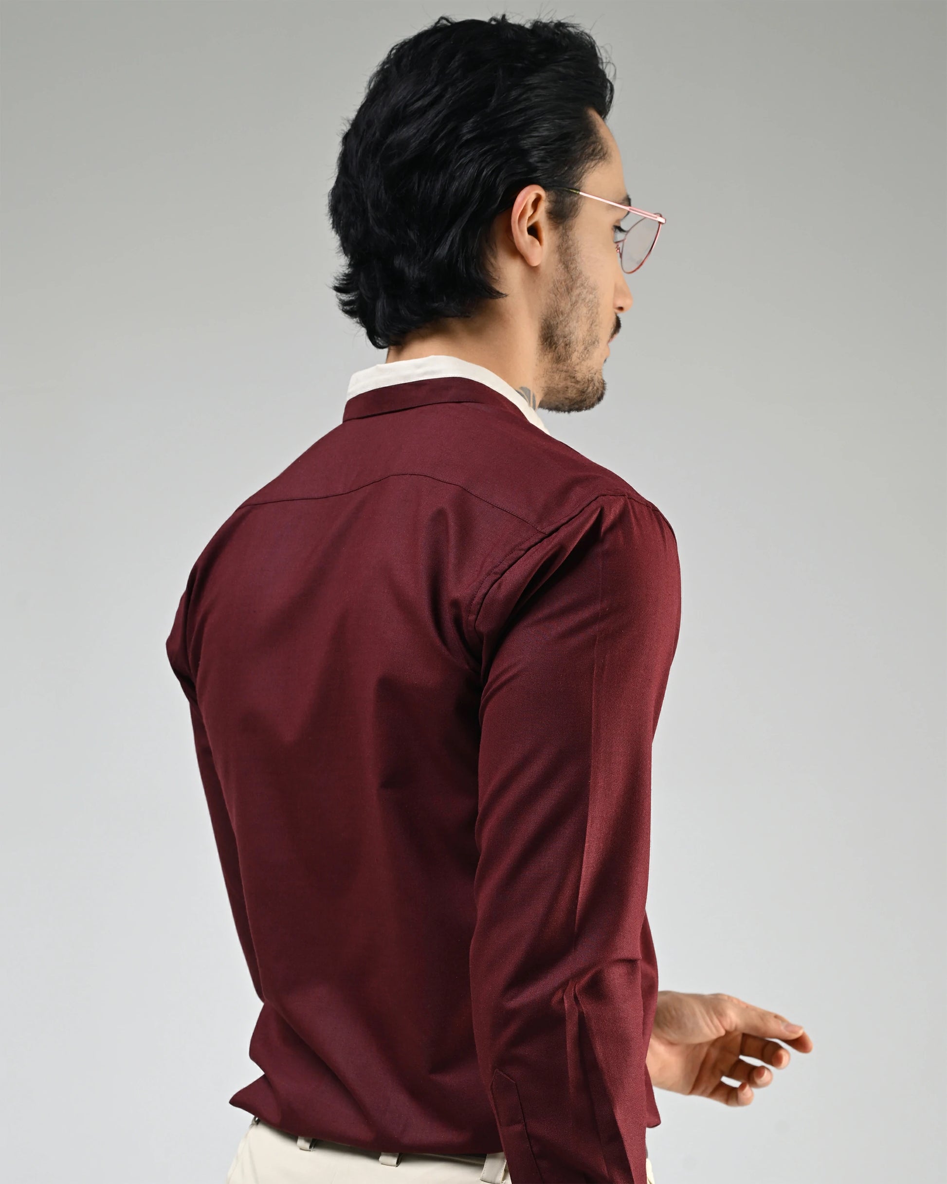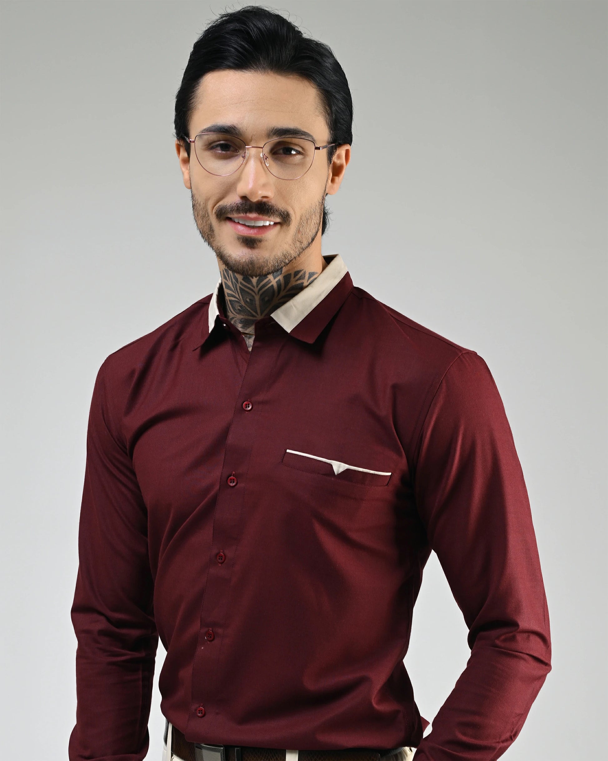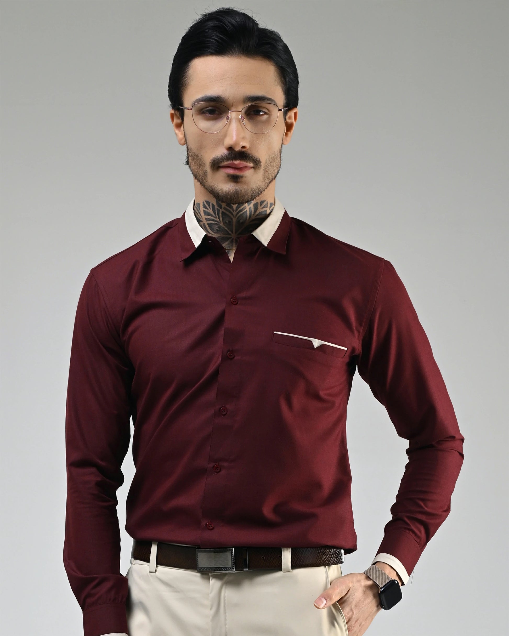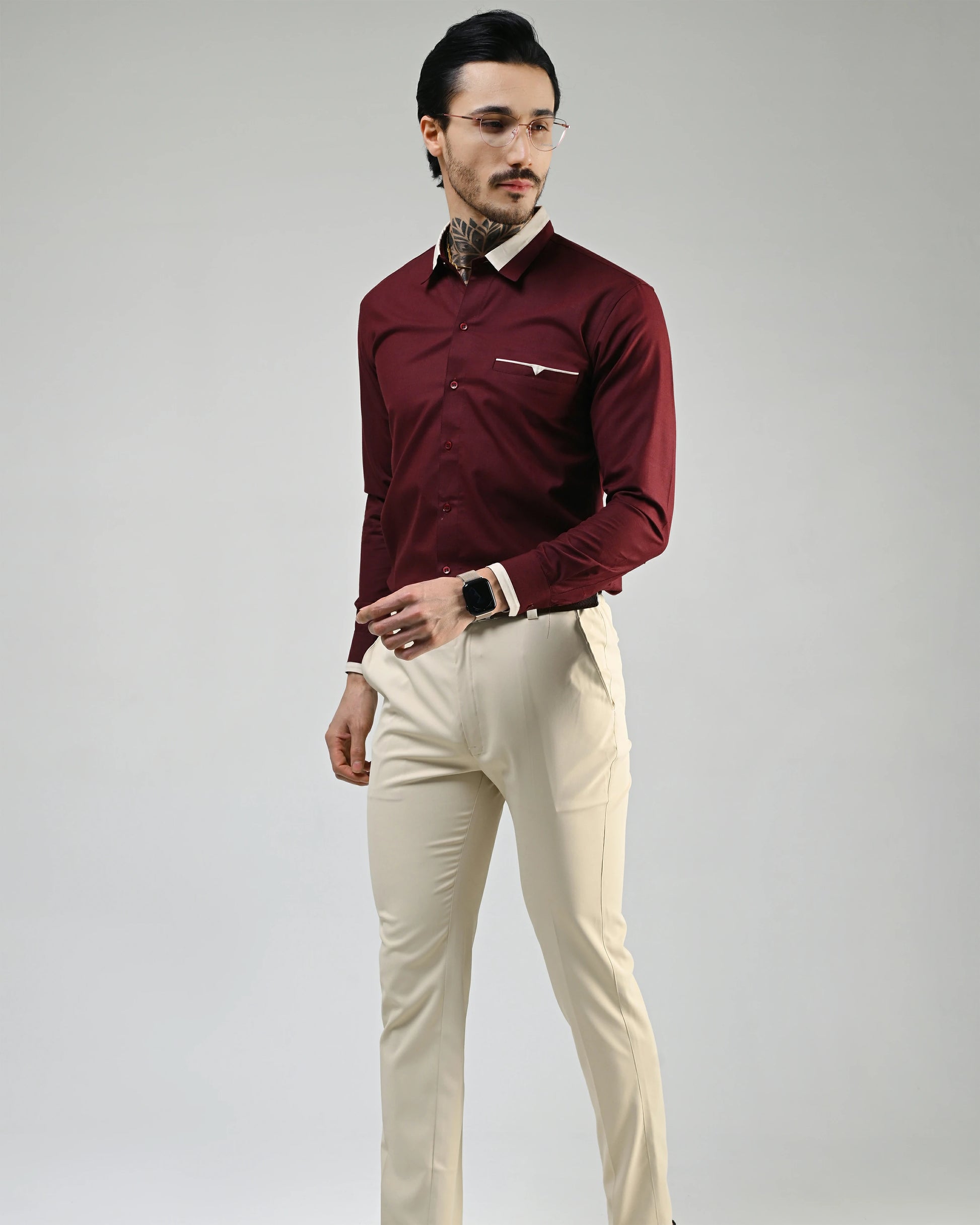 Elevate your formal wardrobe with this rich maroon shirt, accentuated by refined ivory contrast detailing on the collar, pocket, and sleeve edges. crafted from a breathable cotton-blend fabric, it offers a tailored fit with a clean, modern edge perfect for both work and evening outings. paired effortlessly with classic ivory formal trousers, the ensemble delivers a striking monochrome statement.