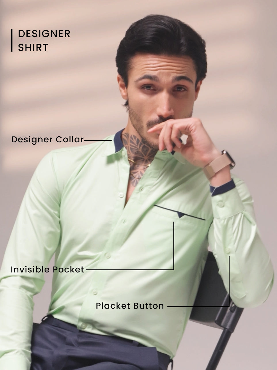 Refresh your wardrobe with this pastel green shirt, elevated by contrasting navy blue detailing on the collar, cuffs, and chest pocket piping. the soft tone brings a modern freshness, while the dark accents add a sharp edge perfect for making a subtle yet confident style statement. paired with deep navy trousers, it creates a balanced, crisp ensemble that works effortlessly from day meetings to evening outings.